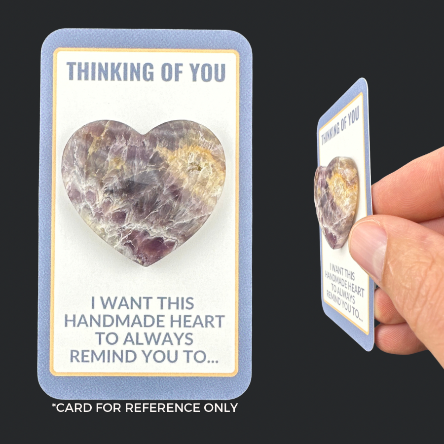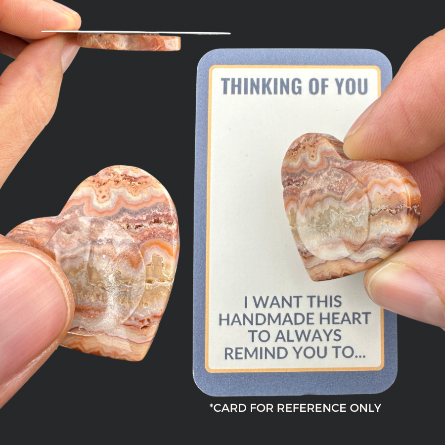 If you get a translucent heart rock (this works very well with Agates, Carnelians, Moss Agates, and some Dream Amethyst), I recommend sticking it to a South-facing window so the sun will shine through it. It's a simple way to give yourself a daily glowing reminder that you matter, are loved, and are not alone. (I attached a picture showing how it's done.)