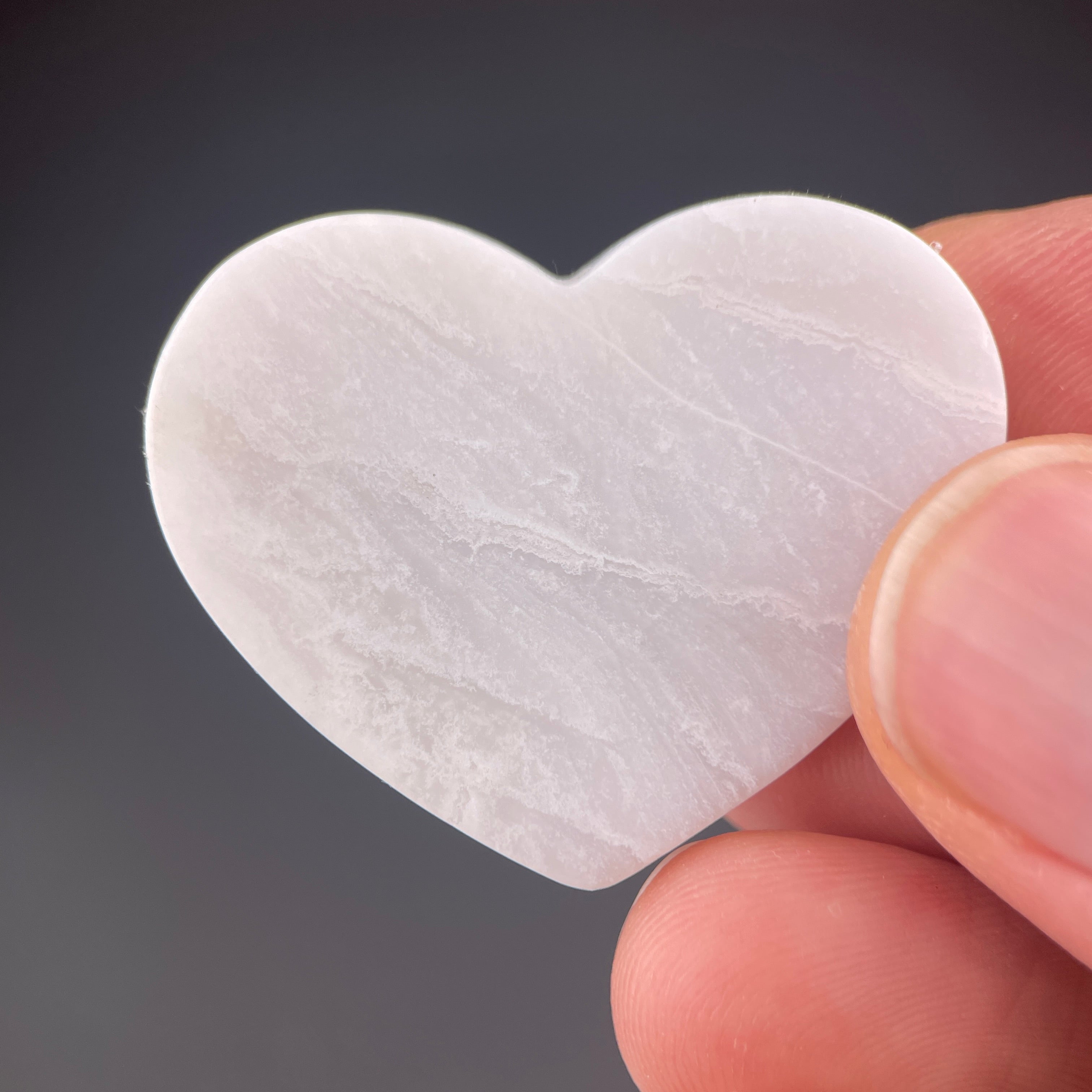 Each heart is cut from natural White Lace Agate. They'll share many similarities, although each one is unique.